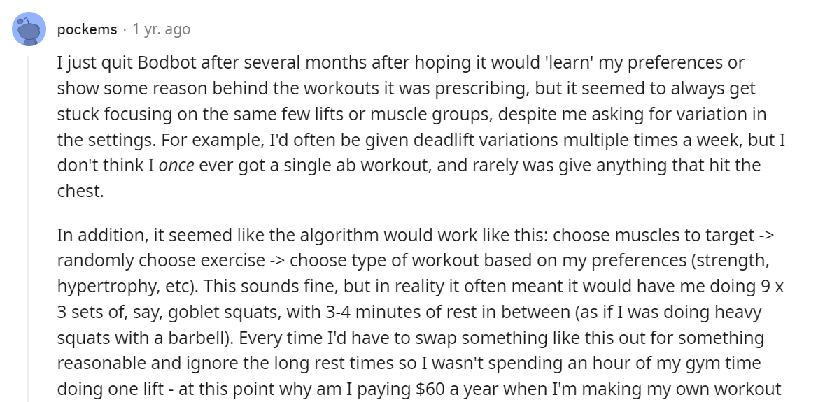 Bodbot caused a lot of red flags to go up for me. For instance, I saw numerous errors in exercise selection, rep schemes, as well as multiple complaints concerning customer service. Even worse, I saw multiple instances where exercises where being performed in manners that would cause injury along with poor explanations. In conclusion, using “AI” to produce fitness programs doesn’t matter if the ones who designed it don’t understand basic fitness principles.
