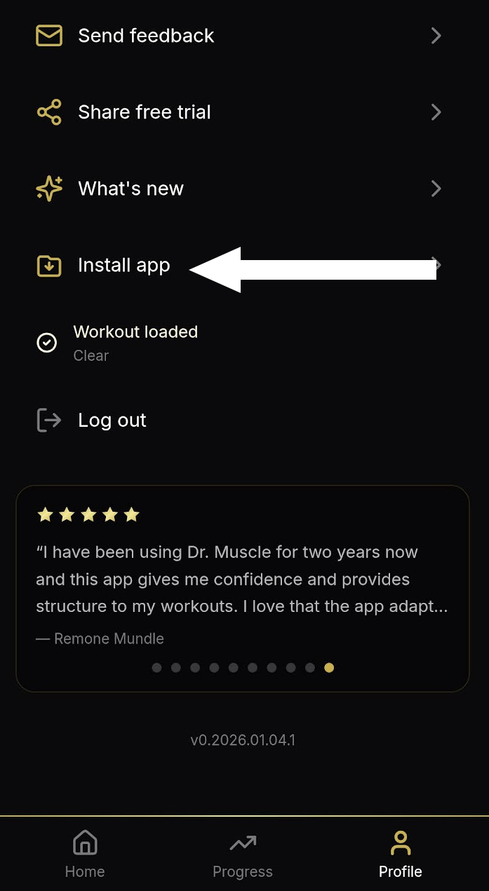 Go to x.dr-muscle.com and log in with your existing email and password. To install it on your phone for a more native feel, open Profile and tap Install App. No extra download from the app store is needed.