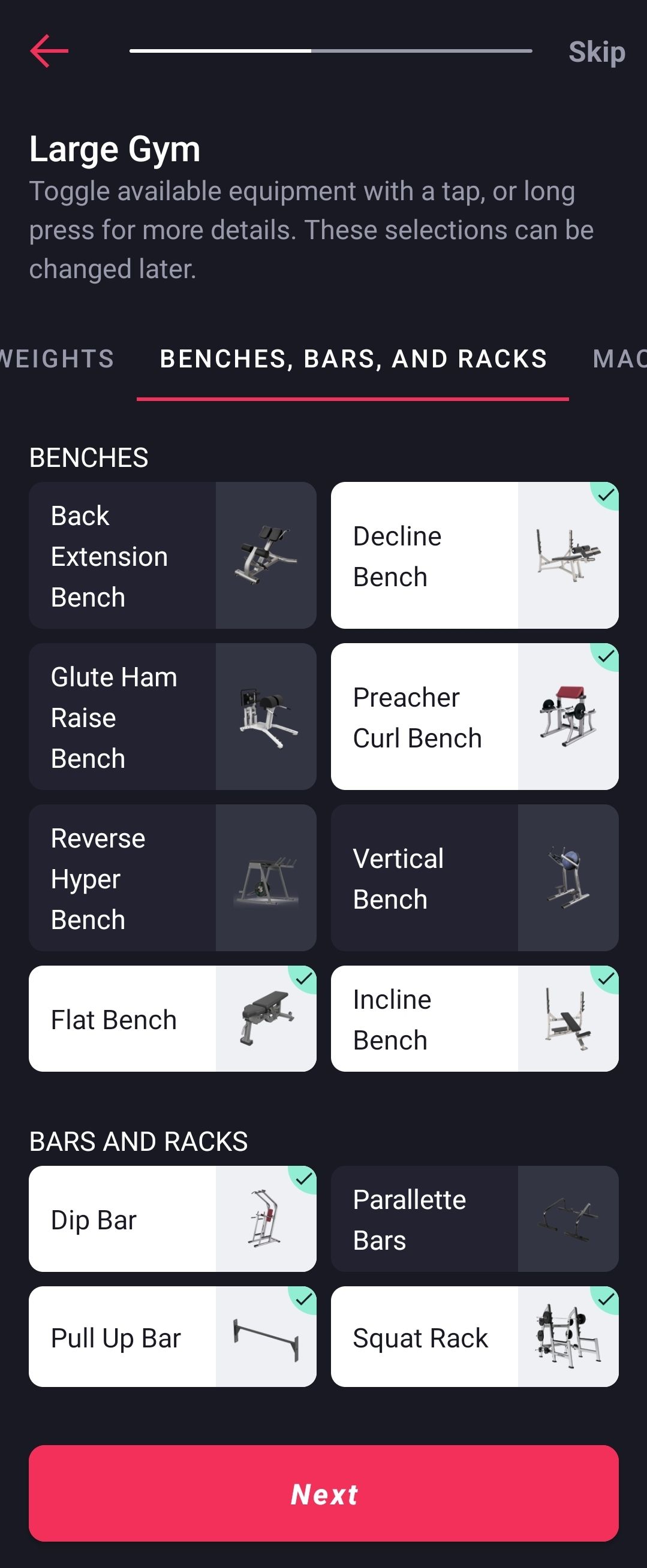 - [Equipment customization based on your answer to the previous question; note different categories of equipment to select, and this is where you can tell the app which pieces of equipment you do or do not have access to by simply tapping each item. The text states that this can be adjusted later, which hopefully allays some of the anxiety of “committing” to equipment too soon.]