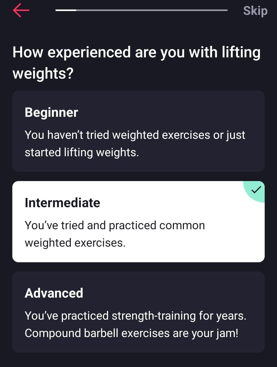 - “How experienced are you with lifting weights?” (I chose “Intermediate” in the hopes that I’d get a middle-of-the-road sampling of what the app has to offer.)