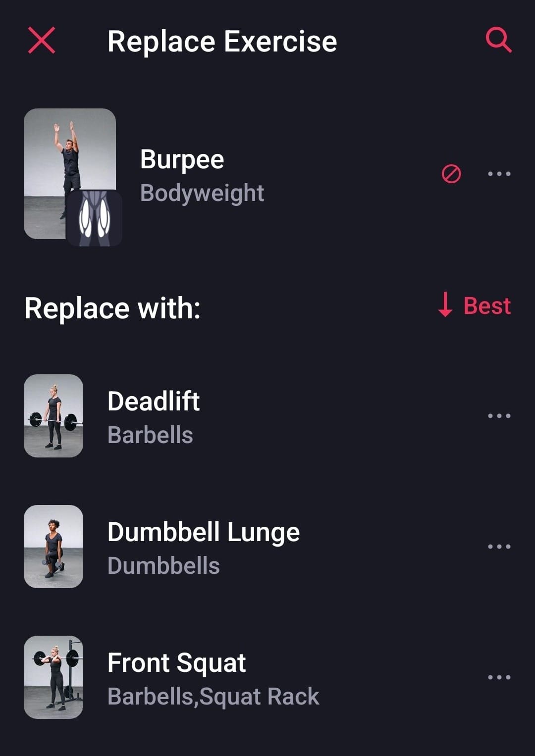 - Tapping the dots pulls up options to view the exercise history, replace the exercise, and pull up instructions with a video. A feature that is currently in beta also allows you to tell the app to recommend that exercise more or less often (or not at all). Since burpees and my knees have a strained history, I went ahead and elected to tell it that. An entire cluster or superset can also be adjusted, so I was able to add a different exercise in the place of burpees to superset with my dumbbell fly.